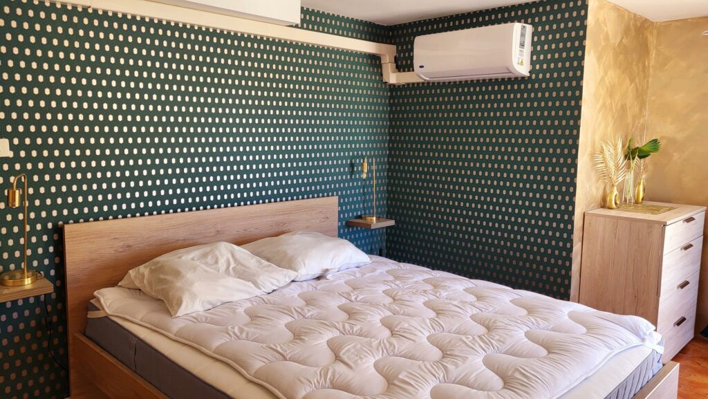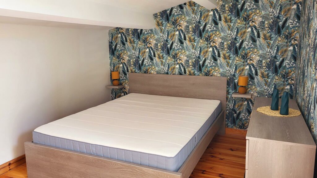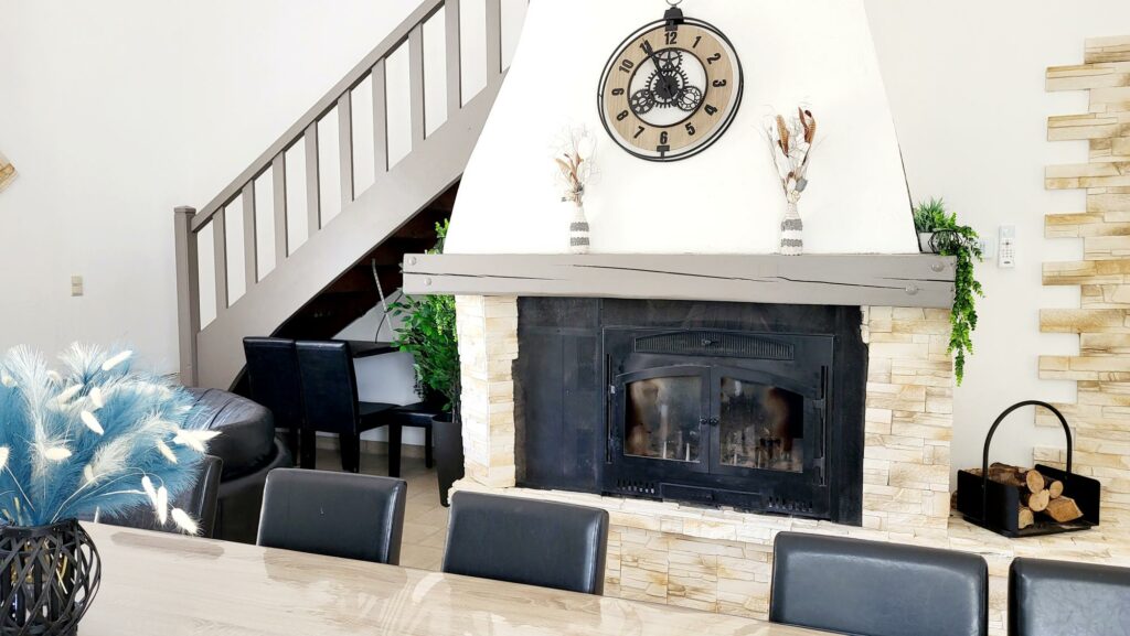 La cheminée qui peut être utilisée. Le bois n’est pas fourni.