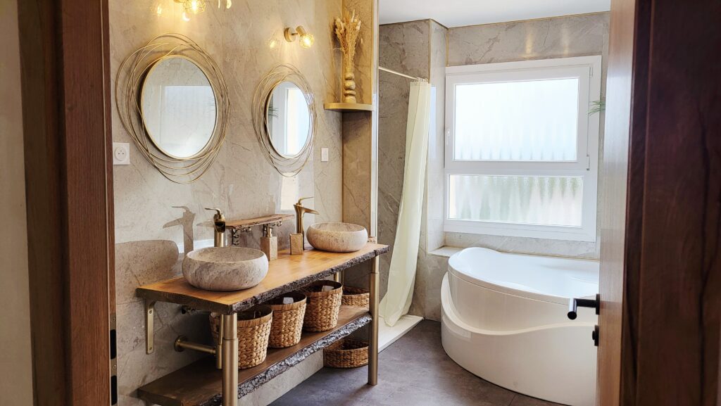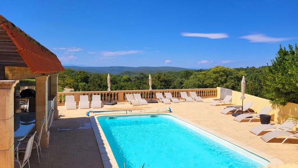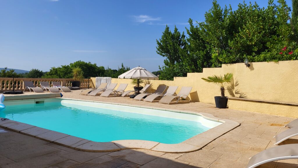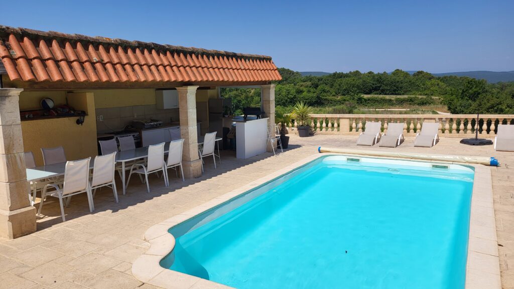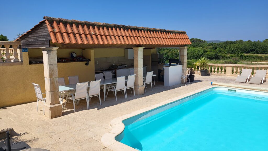 Piscine avec vue à couper le souffle, chauffée, (en saison), sécurisée, avec sa cuisine d’été, bien équipée.